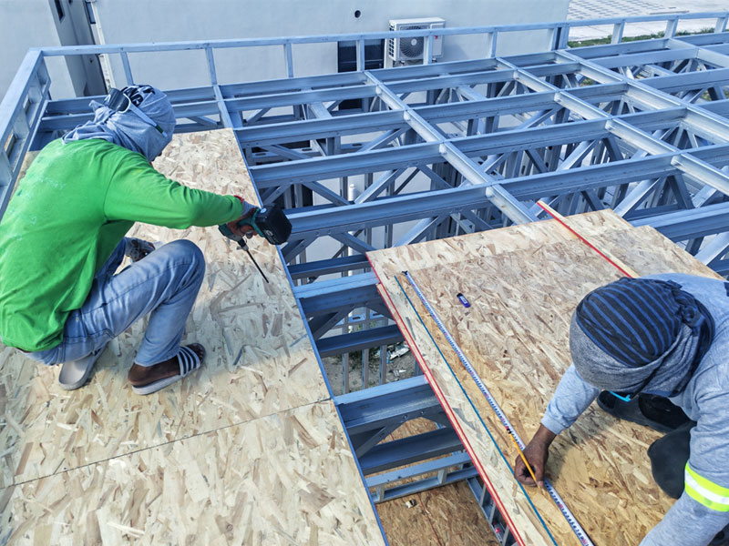 很多業主擔心輕鋼房的露臺踩上去會有“空鼓感”或漏水,這通常是由于施工細節不到位造成的。高標準的施工應遵循以下三個核心環節: