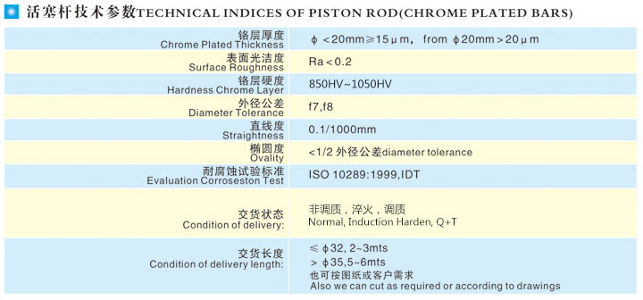 本產(chǎn)品表面經(jīng)特殊研磨及硬鉻電鍍技術(shù)外理,再經(jīng)鏡面拋光而成,具有耐磨擦、抗腐蝕性特性,可用作各種氣缸、油缸、包裝機械、木工機械、紡織機械、印染機械、壓鑄機、注塑機及其它機械的導(dǎo)桿、頂桿。